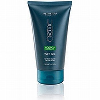 Alfaparf Uomo Wet Gel WET GEL PERFORMANCE Wet Gel defines hair style adding a slight wet effect. HOLD Medium-strong hold for flexible styling. TECHNOLOGY Moringa Extract: it protects against pollution and UV rays while reinforcing and conditioning hair fiber. HOW TO USE Spread on damp or dry hair and proceed with styling.